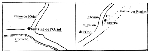 Une fontaine peinte en trompe-l’oeil au milieu de la roche, en bas du vallon de l’Oriol, rappelait la présence de l’eau en ces lieux; la peinture qui s’était dégradée a été supprimée !