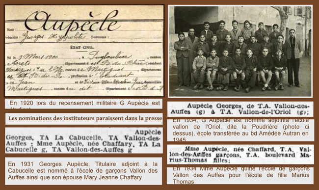 A la demande d’un de ses anciens élèves, j’ai cherché via Généanet des documents retraçant la carrière de Georges Aupècle, directeur de l’école de garçons vallon de l’Oriol (la Poudrière). Le recensement militaire donne les premiers renseignements : Son acte de naissance trouvé dans les Archives départementales des B-du-R en ligne précise la date de son décès. Des articles de journaux indiquent certains de ses changements d’école ainsi que ceux de son épouse.