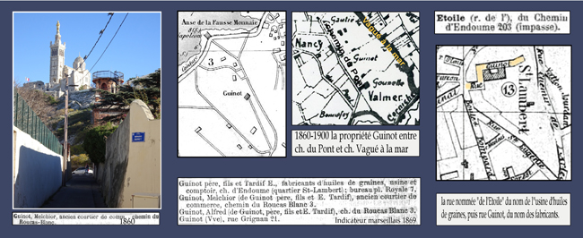 Les cartes anciennes de Marseille mentionnent entre 1860 et 1900, une propriété Guinot (voir carte ci-dessus) sise entre le chemin du Pont et le chemin Vagué à la mar (rue du Dr Fr Granier).