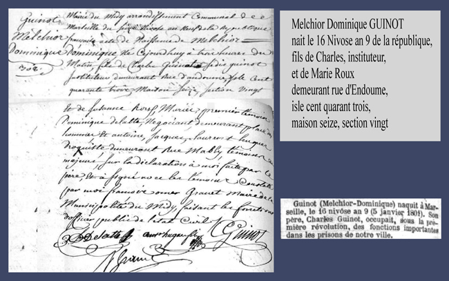 Je me suis donc intéressée à Melchior Dominique Guinot : son acte de naissance indique qu’il est né le 16 Nivose an 9 (5 janvier 1801) de Charles, instituteur, et Marie Roux. La famille demeure rue d’Endoume isle 143, maison 16, section 20; la localisation de cette maison est difficile vue la division géométrique de la ville qui a été instituée durant cette période post-révolutionnaire.