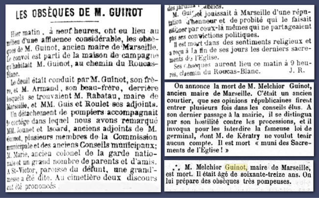 De nombreuses recherches dans l’Indicateur marseillais (1842-1914) et dans la presse locale du XIXe siècle (accessible via Généanet), m’ont permis de retracer le parcours de vie de Melchior Guinot et l’origine de la rue de « l’Etoile » aussi appelée rue Guinot