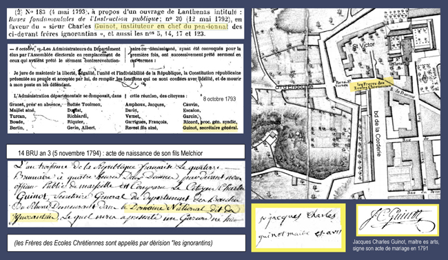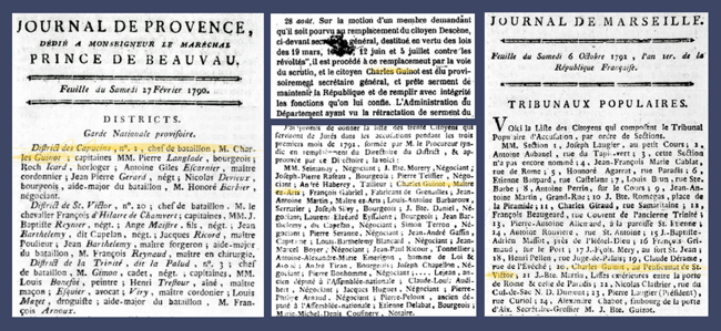 Lors de son mariage avec Suzanne Roux, le 21 septembre 1791, Jacques Charles Guinot, né en 1751 dans les Vosges, demeure à Marseille place St Louis (actuel cours St Louis) depuis 18 ans. Il est « maitre es arts » : il s’agissait du diplôme délivré par une congrégation religieuse certifiant des études après le baccalauréat; il permettait à celui qui l’obtenait, de porter le bonnet « maitre es-arts » et d’exercer la profession de « maître ».