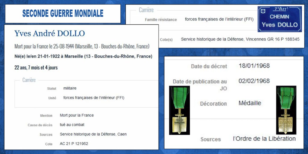 Une plaque souvenir, aujourd’hui disparue, au 2 chemin du vallon de l’Oriol, maison habitée par la famille Dollo (instituteurs) rappelait le souvenir d’Yves, le fils, jeune FTPF de 22 ans mort le 25 août 1944 au cours d’une mission. Jeune requis à la Défense Passive, alors qu’il emprunte les Quatre Contours (avenue David Dellepiane), allant chercher du lait pour un bébé, il est abattu par un tireur allemand posté à N D de la Garde. La circulation est dangereuse pour tout piéton pendant ces rudes journées de la libération, les occupants harcelés, voyant des terroristes partout, déclenchent des tirs sur tout ce qui bouge.