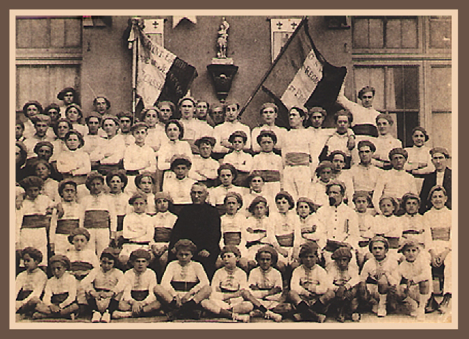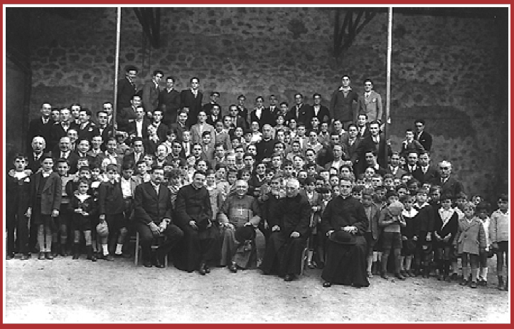 Ces messieurs de « l’Oeuvre » : devant Mrg Dubourg, évêque de Marseille de 1928 à 1936, à sa gauche Mr l’abbé Castelin curé de la paroisse St Cassien, entourés par près de 120 enfants, jeunes et adultes