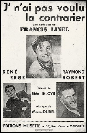 Ci-dessous, le chanteur Francis Linel (du Panier) a lui. aussi interprété des œuvres de Géo Saint Cyr et Marcel Dubel à l’Avant-Garde.