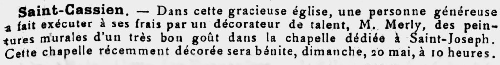 Dans une chapelle latérale, derrière la statue de St Cassien, la toile de fond « St Victor » a été peinte par M. Ricard (habitant du quartier)