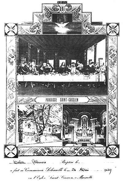 Attestation de Première Communion de Colette Albenois, paroisse St Cassien 1939