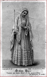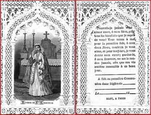 Au XIX° s, des dessins et gravures représentent les communiantes sur les images données en souvenir de la cérémonie.