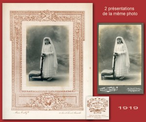 Le même photo a été tirée sous forme de plusieurs cartes postales (destinées aux membres de la famille) et d’un exemplaire unique encadré artistiquement (souvenir pour la jeune fille) par le photographe Marc Tully (dans la liste des professionnels ci-dessous) .