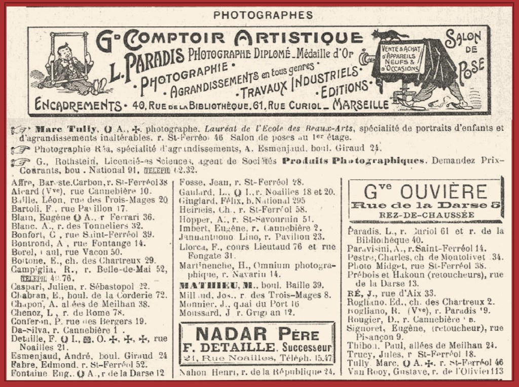 Les photographes inscrits dans l’Indicateur marseillais de 1922 dont les signatures se retrouvent sur les photos d’époque.