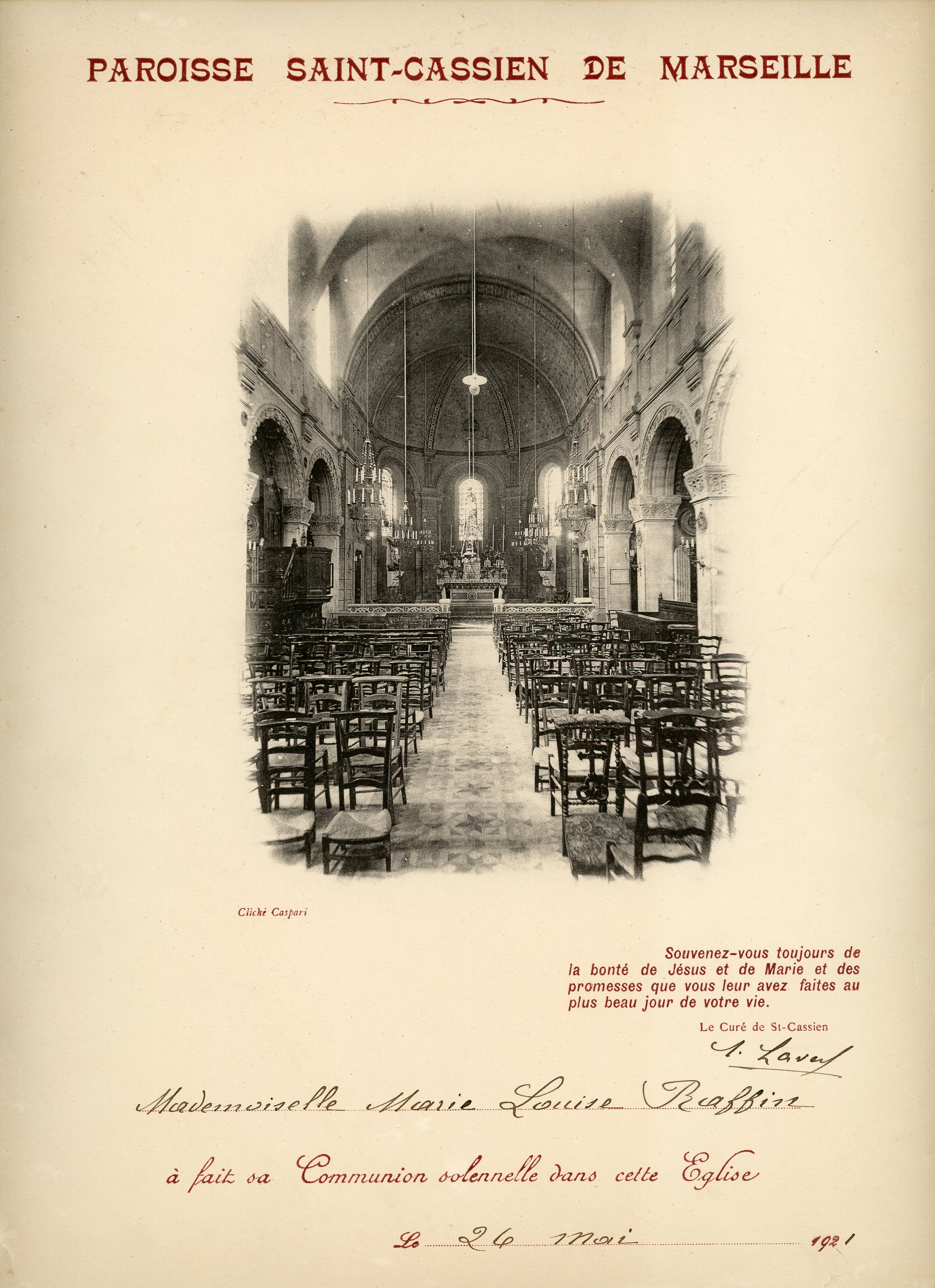 Attestation de Première Communion de M L Raffin, paroisse St Cassien 1921