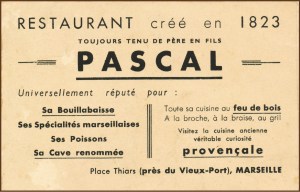 Créé en 1829 et tenu de père en fils, le restaurant Pascal présente une simple publicité dans l’Indicateur Marseillais de 1901 : Soupe de poisson, bouillabaisse et mets provençaux.