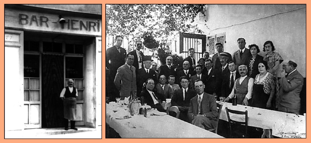 Visite électorale au bar tabac place st Eugène vers 1930 : Henri Tasso, maire de Marseille et Perlet, président du Conseil général (les « Messieurs » portent un chapeau, les autres la casquette)
