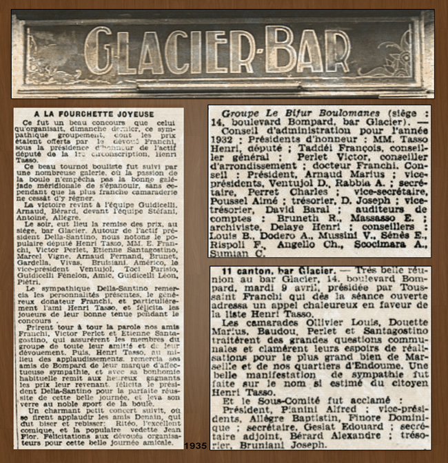 Le Glacier-Bar fut un lieu de rencontres pour les associations du quartier et les réunions politiques dans les années 30. Henri TASSO député, François TADDEI conseiller général, Victor PERLET conseiller d’arrondissement s’y retrouvent en 1935 comme membres d’honneur des cercles boulistes « Le Bifur Boulomane » et « La Fouchette Joyeuse » et en 1935 pour une réunion pré-électorale du 11e canton.