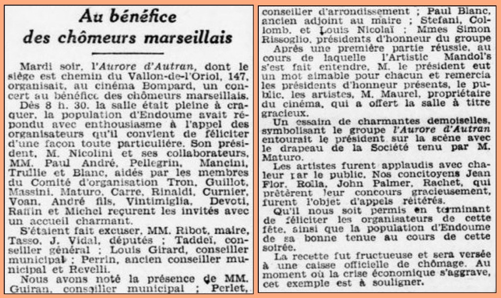 1935 période de crise : 400 F sont distribués aux malheureux. Formation de la « Boule Autranaise » 1936 organisation d’une sauterie suive d’un « ambigu » 1937 A la réunion du C.I.Q. Endoume du 14 avril est mise en place l’organisation de la plus belle Marseillaise, prévue pour les fêtes du 1er mai au cinéma Bompard; mais trop peu de candidates se présentent et l’élection est annulée.