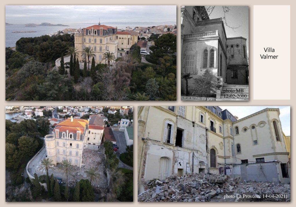 La villa au 1° plan est intéressante pour son style. Elle a été démolie, mais on trouve encore sur la colline de la Garde, des bâtisses présentant une architecture voisine. De forme cubique, ceintes d’un bandeau en ardoises grises, elles ont été vraisemblablement voulues lourdes et austères par des propriétaires aisés, ne désirant pas s’intégrer au gai désordre des cabanons voisins accrochés au flan de la colline.