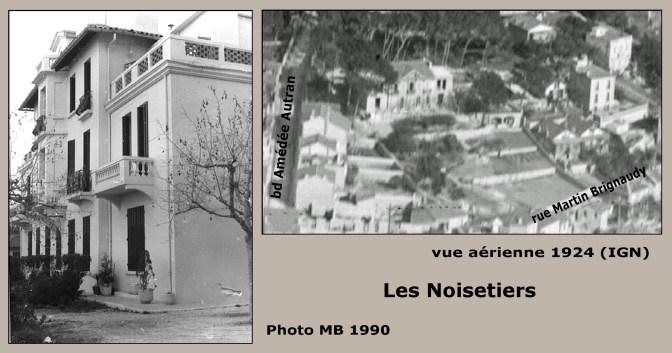 Les Noisetiers, il ne reste de cette propriété que la grande bâtisse connue dans le quartier sous le nom de « gendarmerie ». A l’origine, elle dégringolait jusqu’au bas du bd Amédée Autran où se trouvait son portail (à l’angle du chemin du vallon de l’Oriol). Puis le terrain a été loti le long du boulevard… et après sur la rue Martin-Brignaudy.
