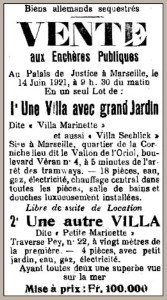 la villa Marinette a été renommée villa Seeblick (Vue sur mer) par Chistian Hoefer, représentant de commerce de nationalité allemande, domicilié en France depuis 1890. Suite au décret du 27 septembre 1914 qui permettait de mettre sous séquestre les biens dépendant des maisons allemandes sur le territoire français, sa villa est mise en vente aux enchères le 14 juin 1921. En 1922 son nouveau propriétaire, Gabriel Bedouin, est agent de la Cie des Bateaux à vapeur du Nord.