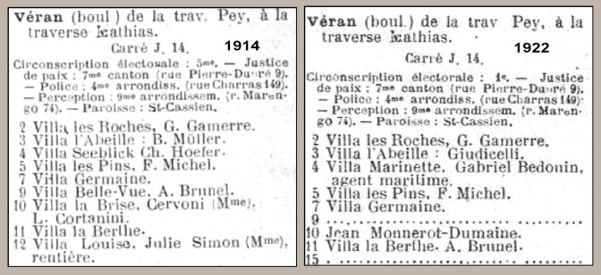 Le bd Véran figure dans l’Indicateur marseillais à partir de 1900 avec trois villas seulement : « La Brise », « Les Roches » et « Nina ». En 1914 douze sont répertoriées.