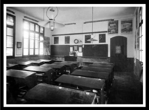Les élèves utilisent une bibliothèque. On peut supposer qu’elle compte parmi ses 108 livres « Le Tour de la France par deux enfants », ouvrage paru en 1877 et sans cesse réédité depuis.