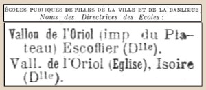 Puis cette école communale est domiciliée 249 b vallon de l’Oriol (à côté de la montée des Boiteux -escalier qui rejoignait par la colline le bas de la traverse Nicolas à la montée Montplaisir, difficilement repérable sur les cartes et les vues aériennes de l’I.G.N.de cette époque) : Mme Isoire la dirige en 1922, puis Mme Simian, Mme Bibal en 1925-26 et Mme Aupècle jusqu’en 1940, date à laquelle l’école est fermée.