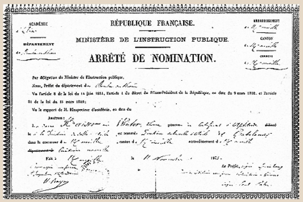 Devenue Mme Kaiser, elle est nommée directrice de l’école maternelle du Roucas Blanc. Ces documents sont conservés par sa petite fille, Roberte Vial-Orus, ancienne directrice de cette même école maternelle.