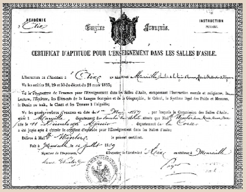 Mme Laure Winter obtient le certificat d’aptitude pour l’enseignement des salles d’asile le 14 juillet 1869; elle est nommée aux Catalans le 11 novembre 1873 (salle d’asile rue Girardin).