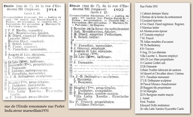 A noter tout d’abord que la rue de l’Étoile (il paraitrait qu’elle a aussi été appelée rue Guinot, mais je n’ai pas trouvé de docs en témoignant cf https://la-butte-bompard.fr/2023/02/18/guinot-melchior/ ) a été renommée « rue Perlet » en 1926.