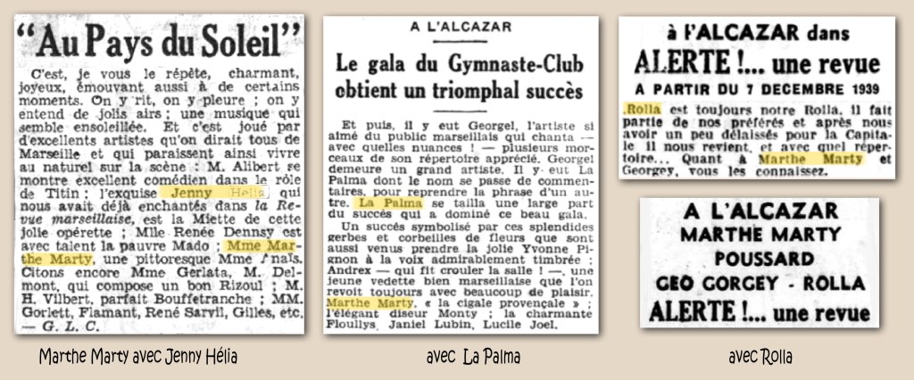 Marthe Marty a partagé la scène avec sa sœur Jenny Hélia, mais aussi avec Rolla, chanteur qui habitait 74 bd Bompard, villa « Les Larmes de Pierrot », et La Palma qui habitait au vallon de l’Oriol.