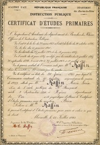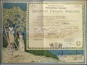 L’initiative de délivrer un certificat d’études primaires est laissée aux inspecteurs en 1866 ; puis l’organisation de ce diplôme pour les enfants de 12 à 16 ans devient obligatoire dans toutes les académies en 1882. L’examen comporte alors des épreuves sur le catéchisme, l’histoire sainte, l’orthographe et l’arithmétique.
