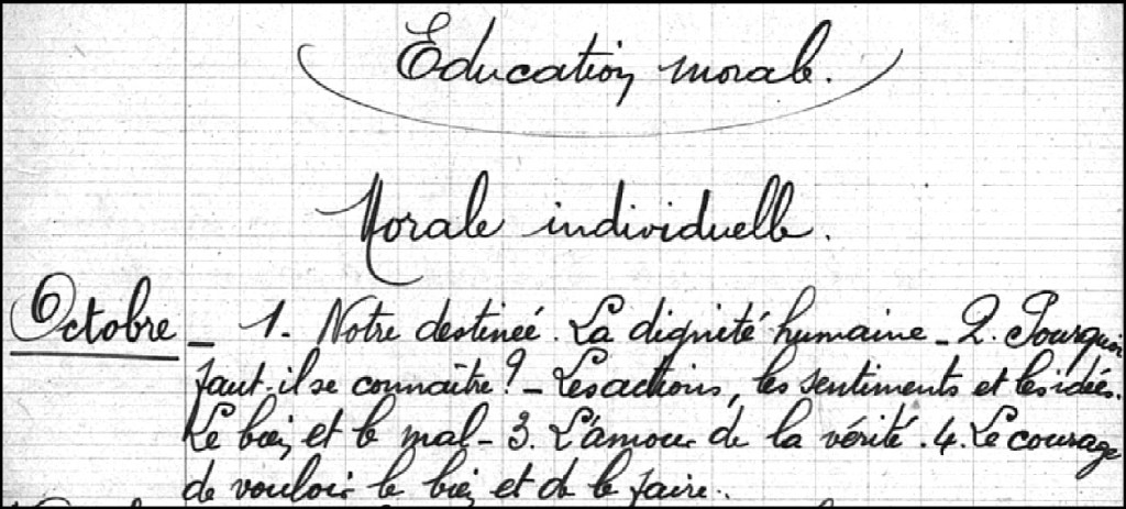 Depuis la laïcisation des programmes de 1882, l’enseignement moral et civique remplace l’enseignement religieux (programmes confirmés en 1923 et auxquels le gouvernement de Vichy n’osera pas toucher) ; l’instituteur doit faire mûrir et se développer les notions fondamentales de la morale éternelle et universelle. En 1886, les instructions précisent qu’il doit faire ressentir à l’enfant « la majesté de la loi morale » à l’aide d’exemples concrets (trois séances d’une demi heure par semaine) ; le précepte qui en découle est écrit sur le tableau noir et appris par cœur.