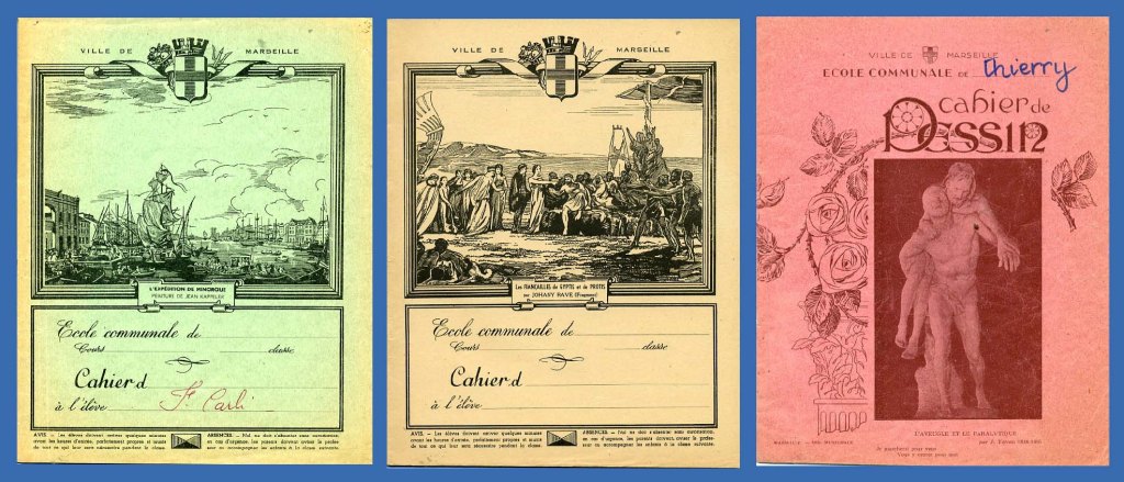 Beaucoup d’écoliers des années cinquante se souviennent des cahiers fournis par la ville de Marseille qui leur faisaient découvrir l’histoire de leur cité vieille de 2600 ans, cahiers du jour aux couvertures bleues, roses ou vertes illustrées avec des reproductions de tableaux célèbres : les fiançailles de Gyptis et Protis, ou l’expédition de Minorque, ou les œuvres des sculpteurs marseillais Pierre Puget (le Milon de Crotonne) et Turcan (l’Aveugle et le paralytique).