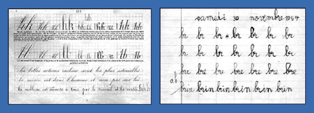 Cahier de modèles pour le maître (1925) et cahier d’élève (C P école Bompard, 1951).