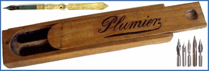 Le plumier en bois abrite règle, gomme, crayons noirs « en cèdre odorant » et crayon « fuschine » (dont la mine mouillée laisse un tracé violacé indélébile), plumes, « sergent major » et porte-plume, porte-crayon d’ardoise et petite éponge (l’ardoise utilisée dans le procédé La Martinière permet un contrôle rapide des connaissances; le maitre pose une question de calcul mental, les élèves écrivent la réponse sur l’ardoise et la montre au signal).