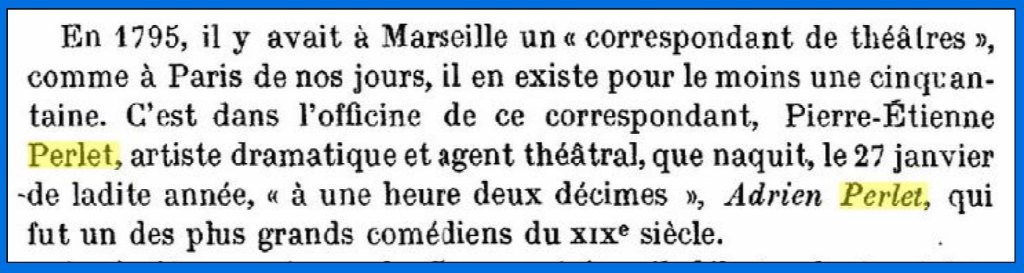 … à Paris. Adrien épousa Virginie Tiercelin, fille de Jacques, aussi acteur et directeur des théâtres de la Gaîté, des Troubadours, des Variétés. Il Perlet fit toute sa carrière d’acteur à Paris où il décéda quelques mois après son épouse en 1850.