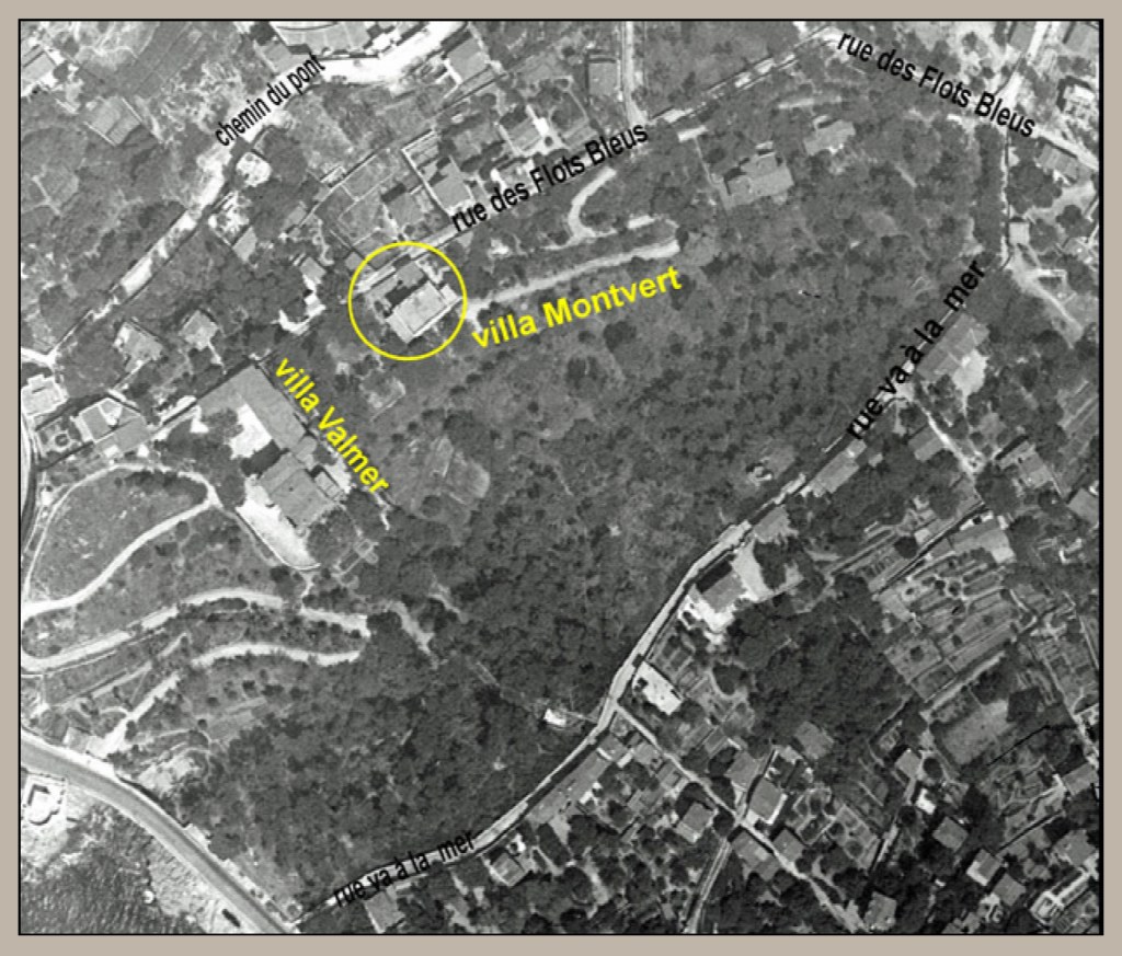 La villa Montvert. La propriété est un vallon naturel prenant naissance à partir d’un plateau formant l’extrémité Est; d’une superficie de 38000m2; elle confronte au Nord rue des Flots-Bleus, à l’Est rue du Dr Fr Granier (rue Va-à-la-mer), au Midi la rue Dr Fr Granier et la villa Valmer; à l’Ouest Gounelle et la rue des Flots Bleus.