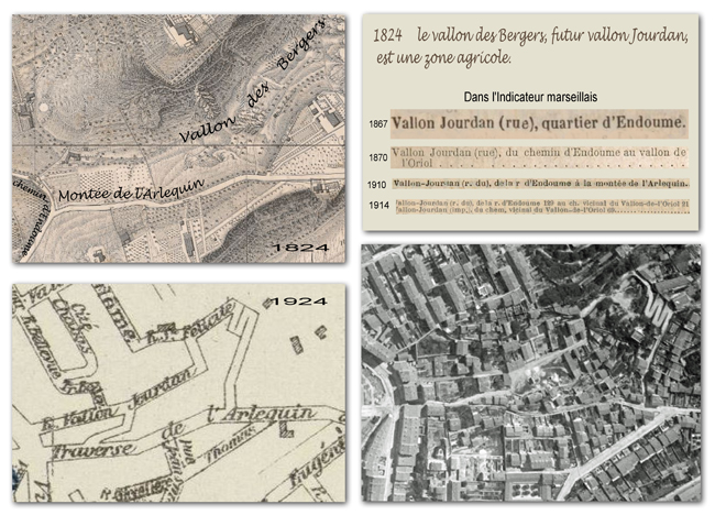 Indiqué sur une carte datant de 1824, le vallon des bergers est une zone agricole que l’on atteignait depuis le chemin d’Endoume par une sente qui deviendra en 1867 la « rue Vallon Jourdan« .