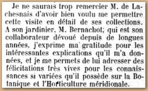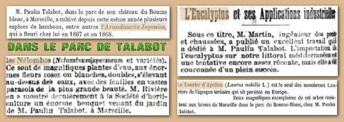 De nombreux articles dans la presse locale de l’époque font état des plantes remarquables qui apparaissent dans la propriété de ce passionné de botanique et d’horticulture : l’Arundinaria Japonica -espèce de bambou, les Nélombos -plantes d’eau, les lauriers d’Apollon, les eucalyptus ….