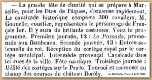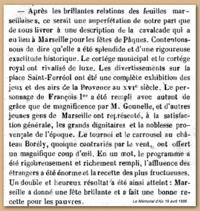 En 1868, s’est déroulé à Marseille pendant trois jours (12, 13, 14 avril) une cavalcade historique rappelant la visite de François 1er à Marseille (22 janvier 1516). Le défilé pompeux, organisé par une œuvre de charité afin de récolter de l’argent pour les pauvres de la ville, fut annoncé dans toute la presse régionale. Alfred Gounelle y représentait le personnage du roi.