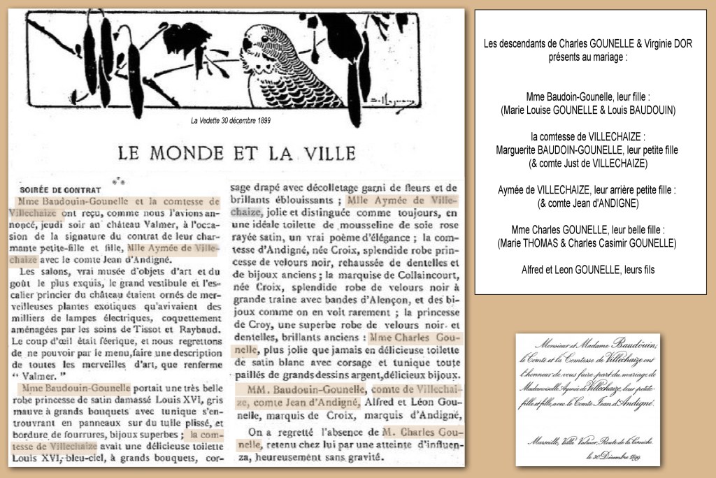 La magazine « La Vedette » décrit avec beaucoup de détails cette soirée (contrat de mariage entre Aymée de Villechaize et le comte Jean d’Andigné passé le 28 décembre 1899; mariage célébré le 29) : les invités, les toilettes des dames, le décor « féérique » des salons…