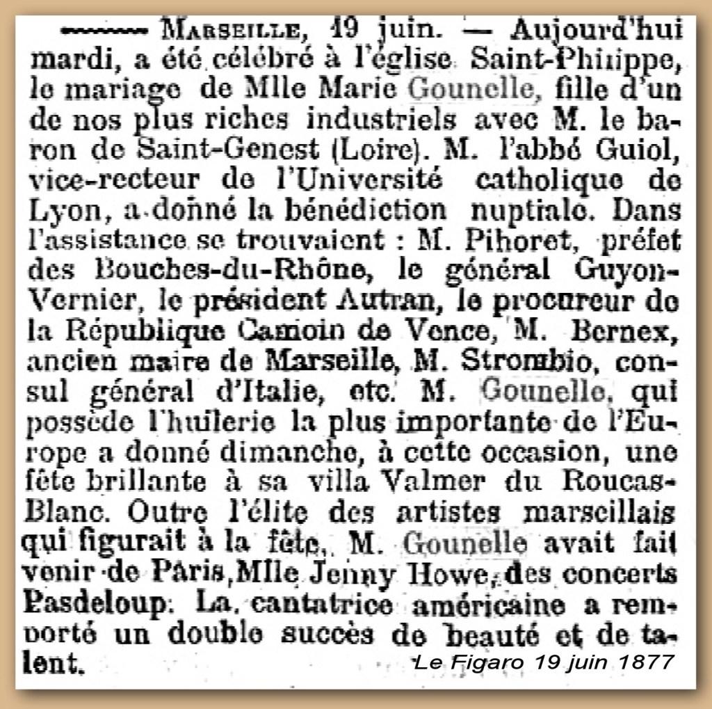 Le premier mariage célébré avec fastes au château Valmer en 1877 est celui Marie Gounelle (fille de Charles) avec le baron de Saint-Genest. Le Figaro du 19 juin 1877 relate : « pour la fête, M. Gounelle a fait venir l’élite des artistes marseillais et une cantatrice américaine ».