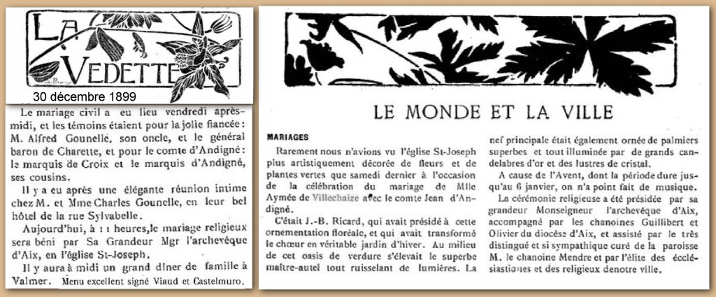 Le magazine La Vedette décrit avec emphase le mariage d’Aymée, petite fille de Charles Gounelle, mariage civil suivi d’une réunion intime, et mariage religieux en l’église St Joseph assisté par « l’élite des ecclésiastiques et religieux de cette ville« , suivi d’un grand diner de famille (menu signé Vaud et Castelmuro).