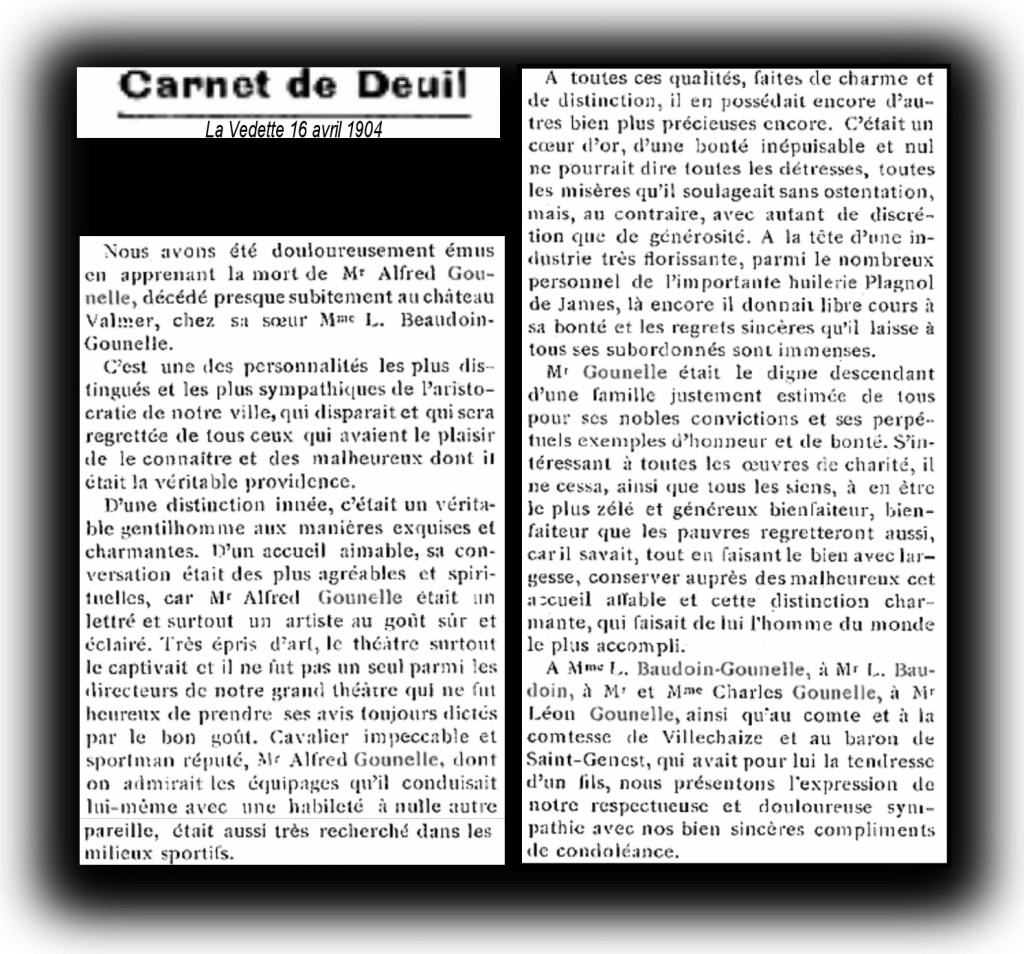 Les décès des membres de la famille Gounelle font l’objet d’articles élogieux dans la presse mondaine, tel celui de La Vedette concernant la mort d’Alfred « une des personnalités les plus distingués (sic) et les plus sympathiques de l’aristocratie de notre ville… un véritable gentilhomme…« .