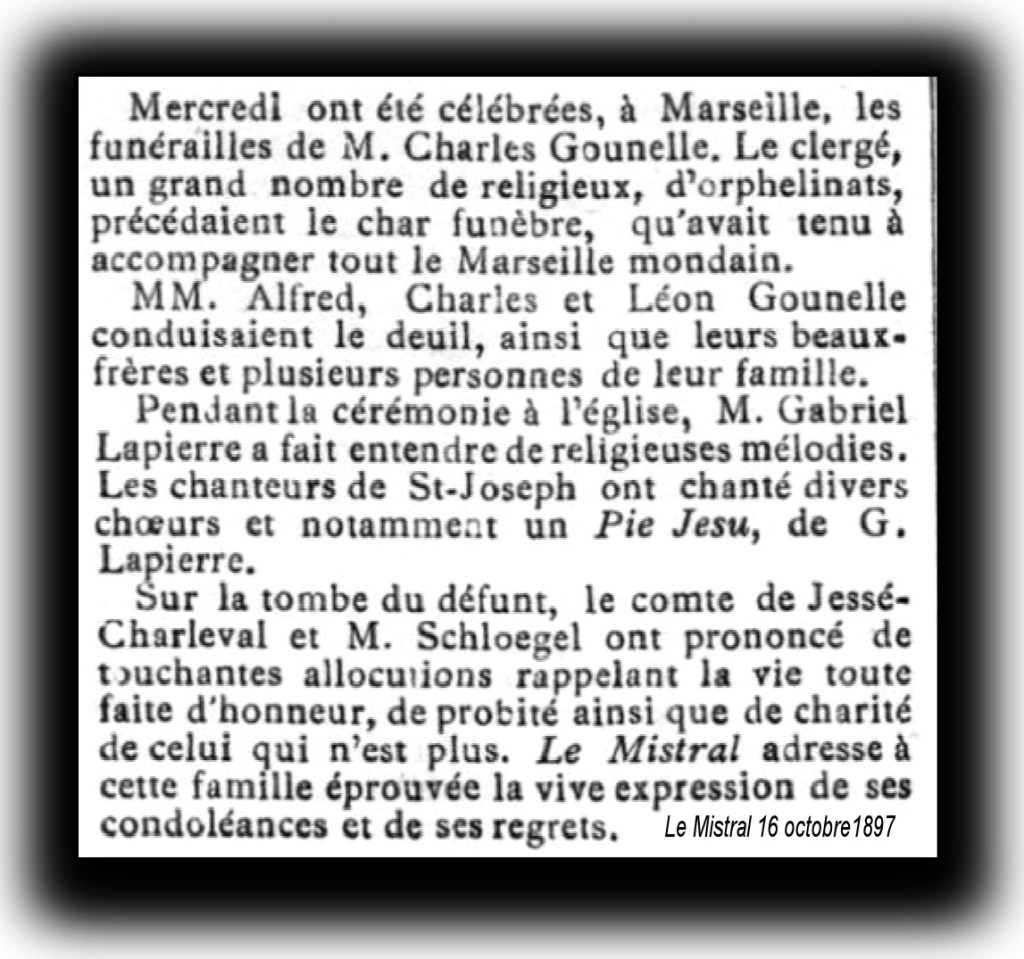 Les funérailles religieuses de Charles Gounelle sont évoquées dans un article du journal « Le Mistral » en 1897 :