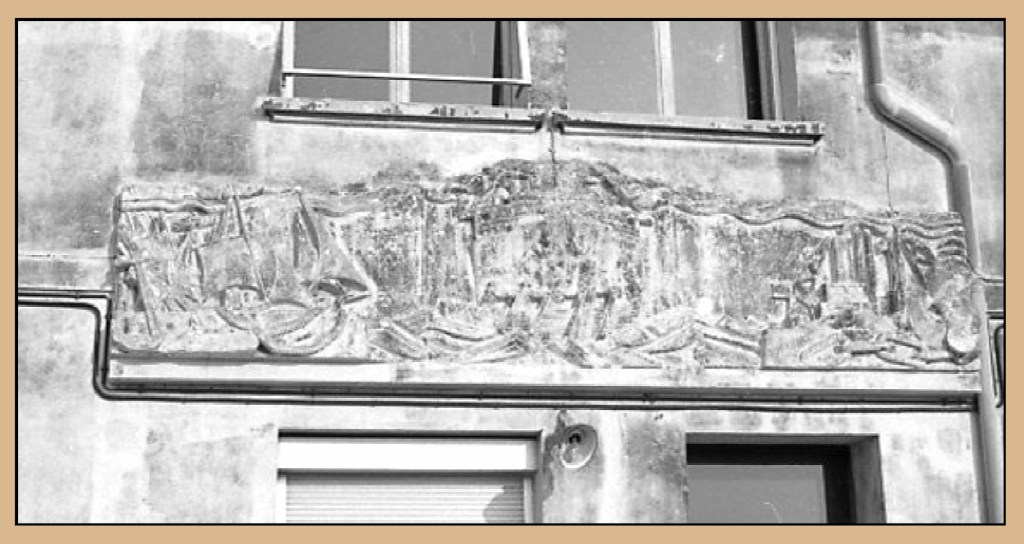 Sur les bâtiments annexes, un bas-relief représentant des bateaux était probablement un vestige de cette école (photo MB 1990).
