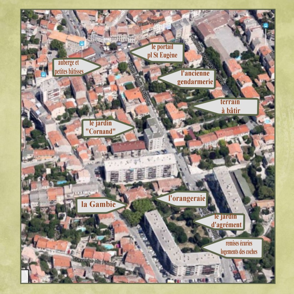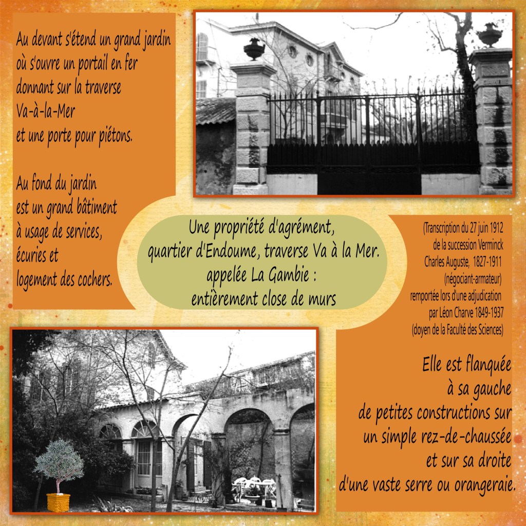 Charles Auguste Joseph Verminck (1828-1911), armateur négociant avec l’Afrique (bureaux et usine Bd de la Corderie 10 ) (d’où le nom donné à sa propriété, La Gambie) acquiert 12 lots situés entre la rue d’Endoume, la rue Vagué à la Mar et le Bd Bompard entre 1860 et 1874. En 1908, la grande maison est louée au consul d’Allemagne; la petite maison attenante ainsi que toutes les plantes notées dans l’inventaire font partie du bail consenti au jardinier Cornand. Ces deux maisons, l’ancienne gendarmerie et le terrain attenant, sont vendus en 1914, au décès de Charles Verminck, par adjudication à Léon Charve, doyen honoraire de la faculté des sciences.