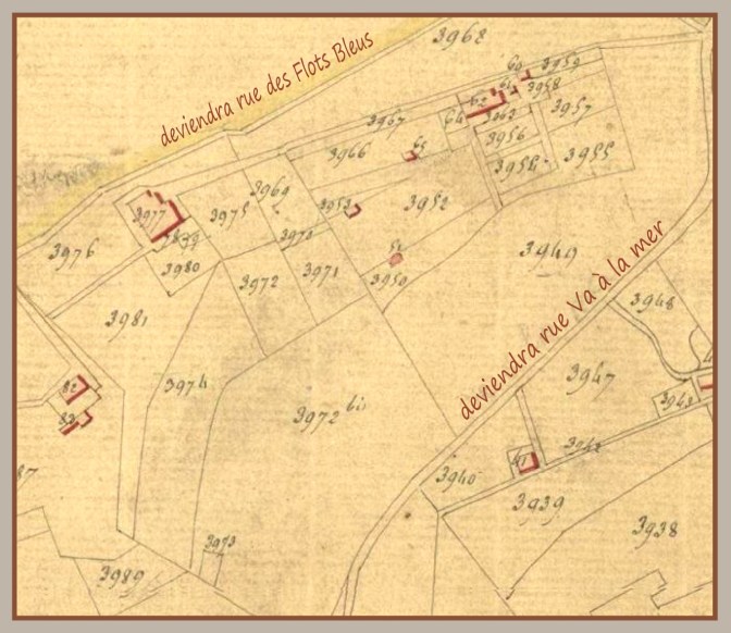 Sur le cadastre napoléonien : la rue des Flots Bleus et la rue Va-à-la-mer sont tracées mais pas nommées (je l’ai fait par déduction).