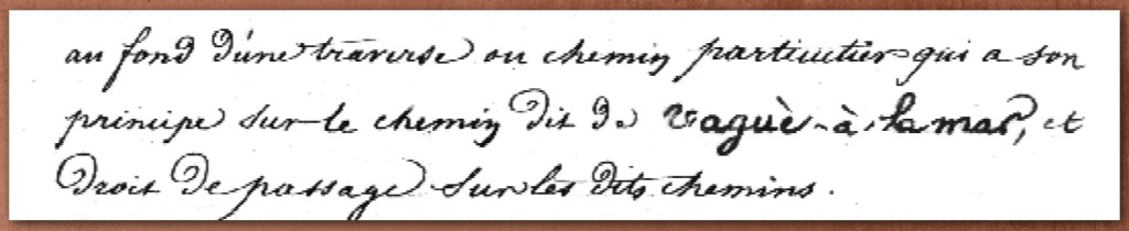 Nom d’origine en provençal : « chemin vaguè à la mar » trouvé dans un acte de propriété :