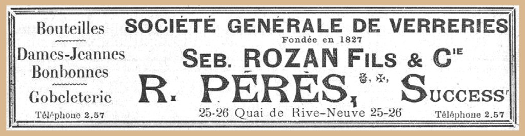 René Pérès a succédé à la famille Rozan (pub 1919) ; la Générale de verreries est désormais 25-26- quai de Rive-Neuve et produit des « Dames-Jeannes ».