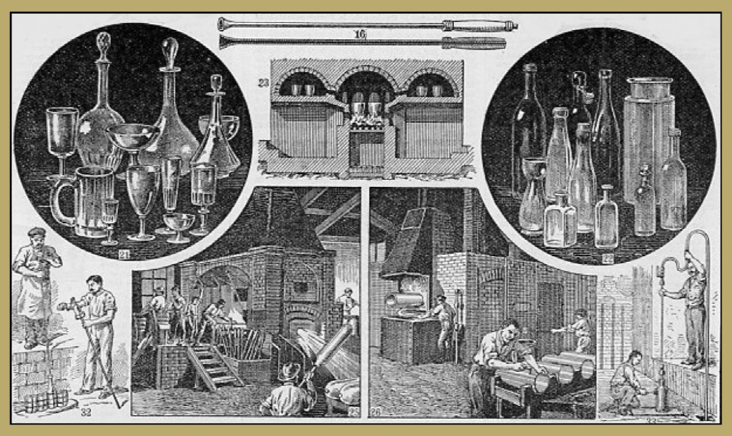 16. Canne de verrier et coupe. 21-22. Gobeleterie. 23. Four à pots (coupe). 32. Soufflage à la bouche d’une bouteille et façonnage du goulet à la main. 25. Soufflage à la bouche du verre à vitres. 26. Coupage des cylindres et étendage au four. 27. Première phase de la fabrication des vitres soufflées.